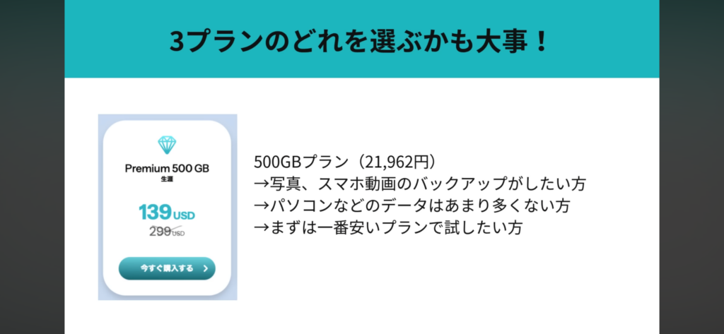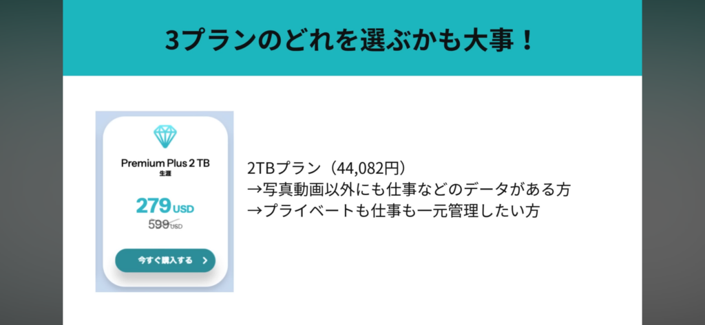 1日あたりに換算すると、2TBプランで約12円。缶コーヒー1本にも満たない金額で、一生分のストレージが手に入る計算です。