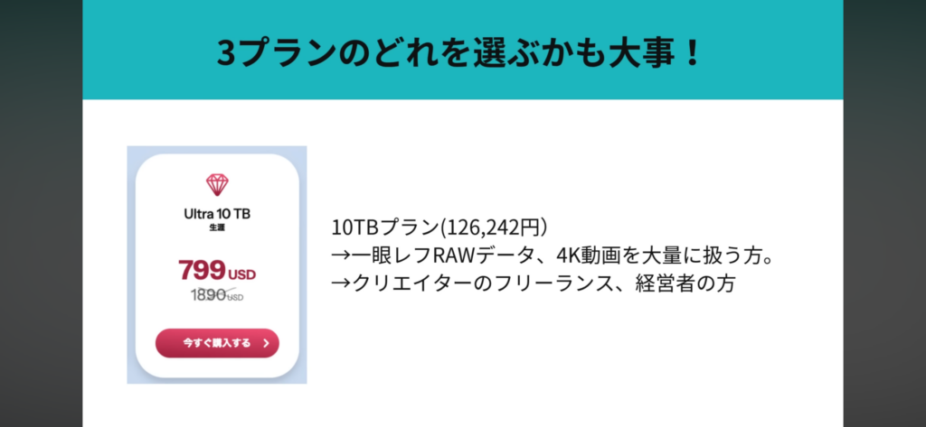 | 10TB 買い切り | $1,890 | $799 | 58%オフ | 約126,000円 |