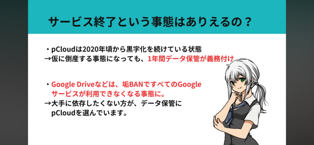 pCloudは2020年頃から黒字化が続いています。万一、会社が倒産する事態になった場合でも、1年間データを保管する猶予が設けられるとのことです。