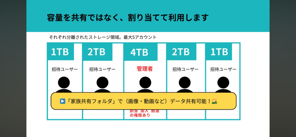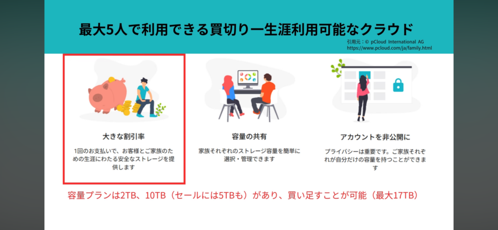 pCloudのファミリープランは、次の特徴を持つユニークなクラウドプランです。
