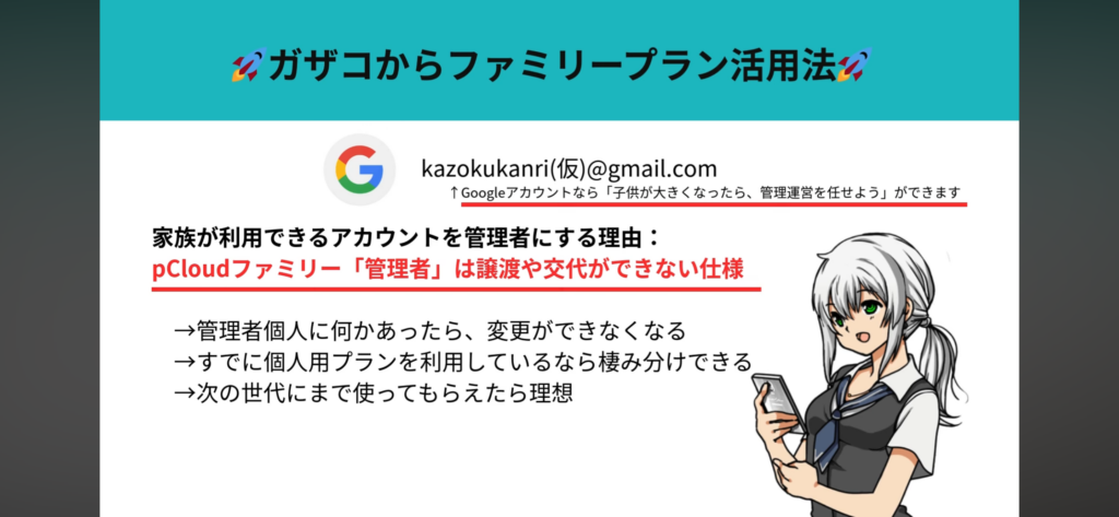 pCloudファミリープランは、現時点(2025年)で 管理者アカウントを交代できません。